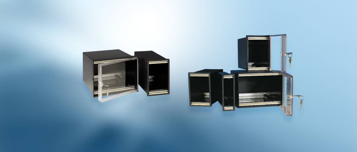These panel instrument enclosures are made of sheet steel (type 443) or plastics (type 446) with a 19” mounting system. They offer mounting possibilities from front and rear and may also be supplied with a transparent door. Both types are available in three different variants. Type 443 can be delivered with a door, without a door or as an empty enclosure. Type 446 is also available as an empty enclosure or it can be made as an enclosure electrical connector (rear: integrated module rail) or enclosure BUS (rear: BUS-module rail).